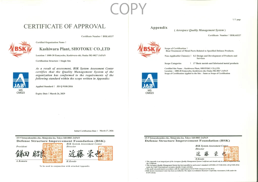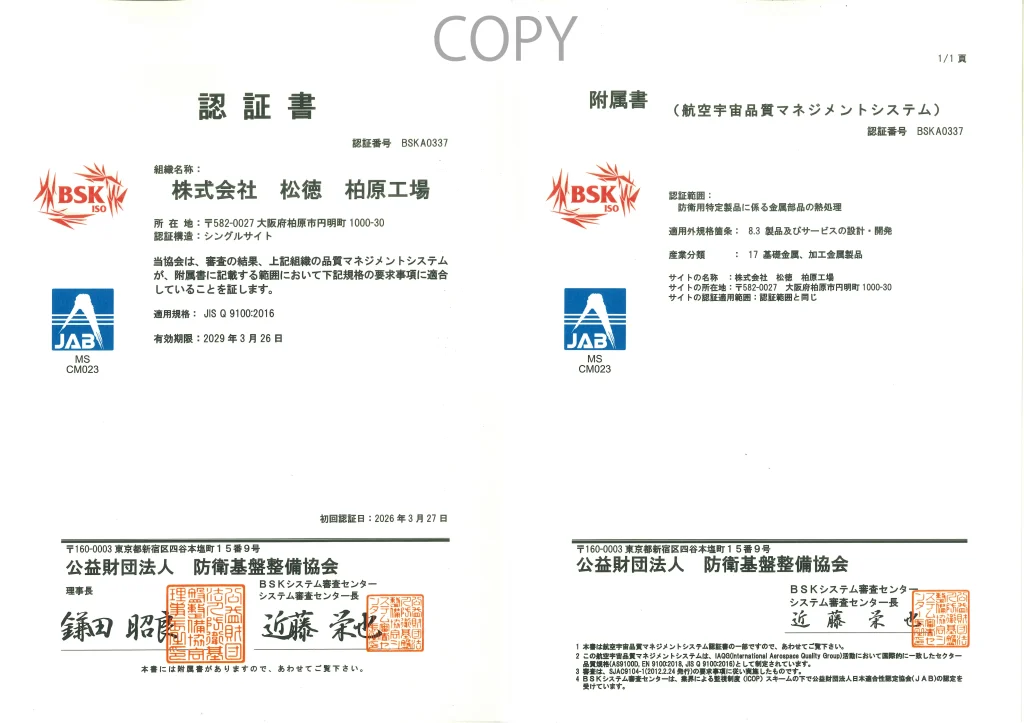 今回は「防衛用特定製品に係る金属部品の熱処理」において当社柏原工場が品質基準に適合していることが証明されたもので、以降、関連企業様との取引がさらにスムーズに行えることになります。本認証を機に改めて全社での品質の向上に努めるとともに、更に航空・宇宙・防衛業界でも当社の熱処理技術の信頼性を高めてまいります。
